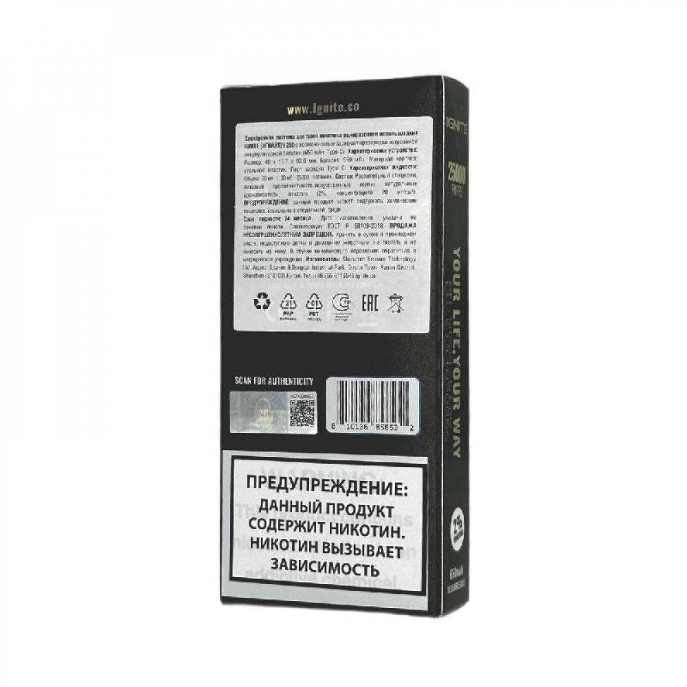 Технические характеристики Электронная сигарета Ignite V250 Gold 25000 - Menthol (Ментол)